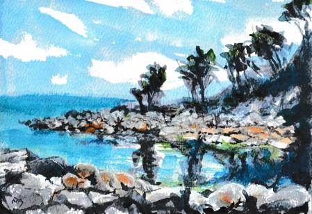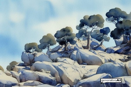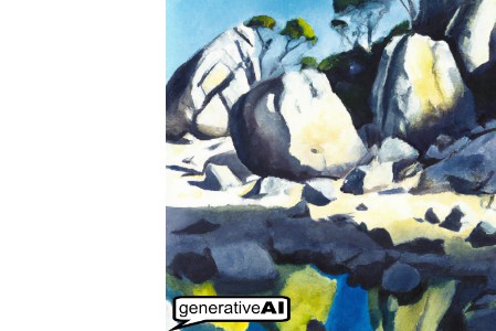 "bright blue sky granite rocks silhouetted trees with strong reflections watercolor painting by hans heysen"